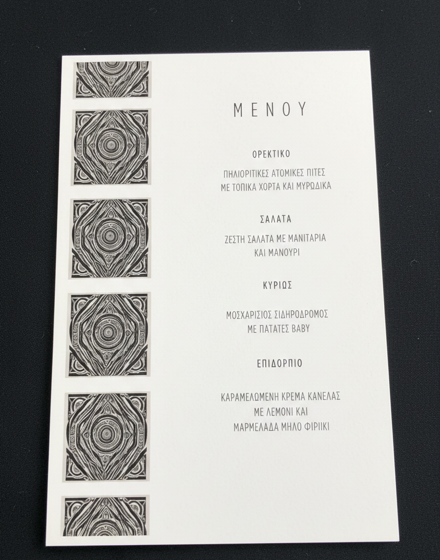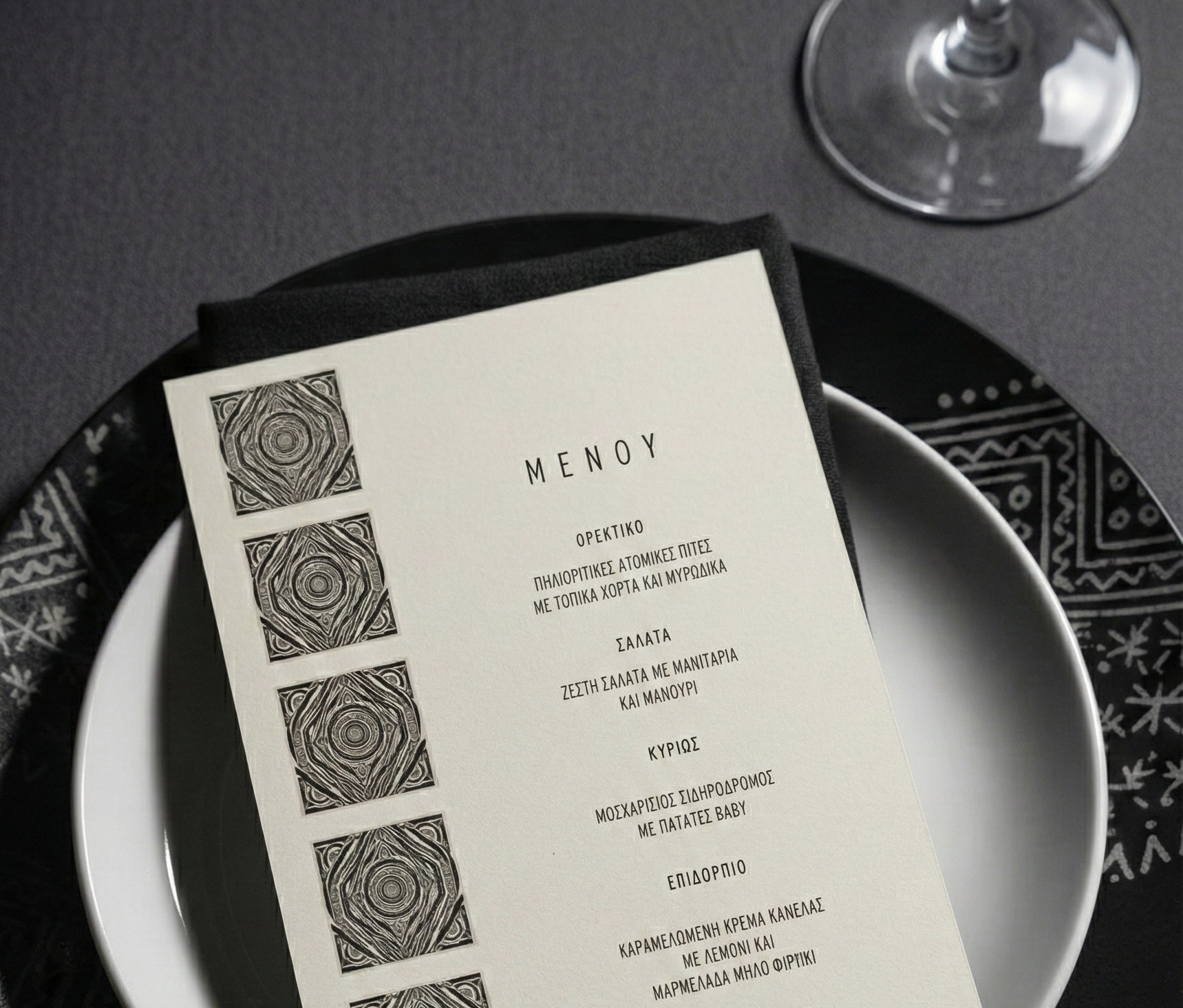 Προσέξτε και την παραμικρή λεπτομέρεια τοποθετώντας κάρτες με το μενού της δεξίωσης σας στα τραπέζια των καλεσμένων σας για ένα πλήρως ολοκληρωμένο event στο θέμα που έχετε επιλέξει.