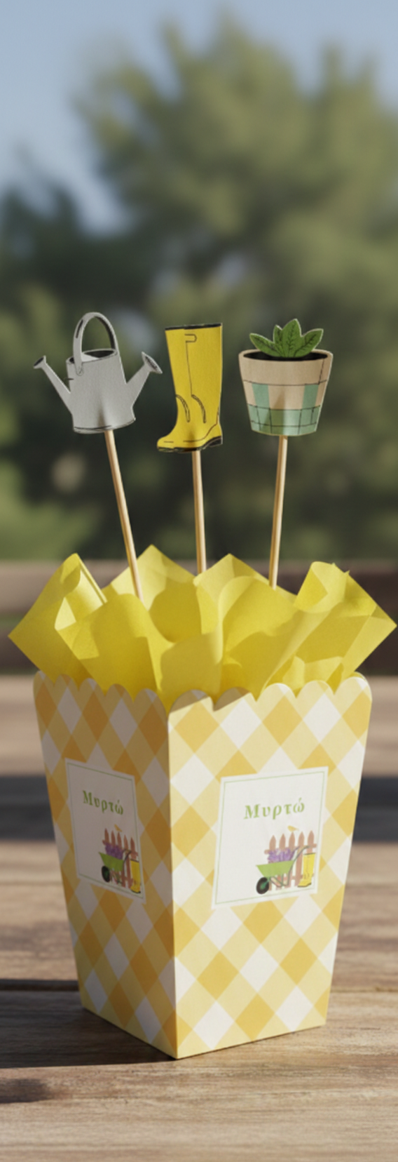 Περιλαμβάνει ένα κασπώ τύπου popcorn box με το όνομα του παιδιού, γεμισμένο με χαρτί αφής και 3 διακοσμητικά σε ξυλάκια στο θέμα της βάπτισης σας.