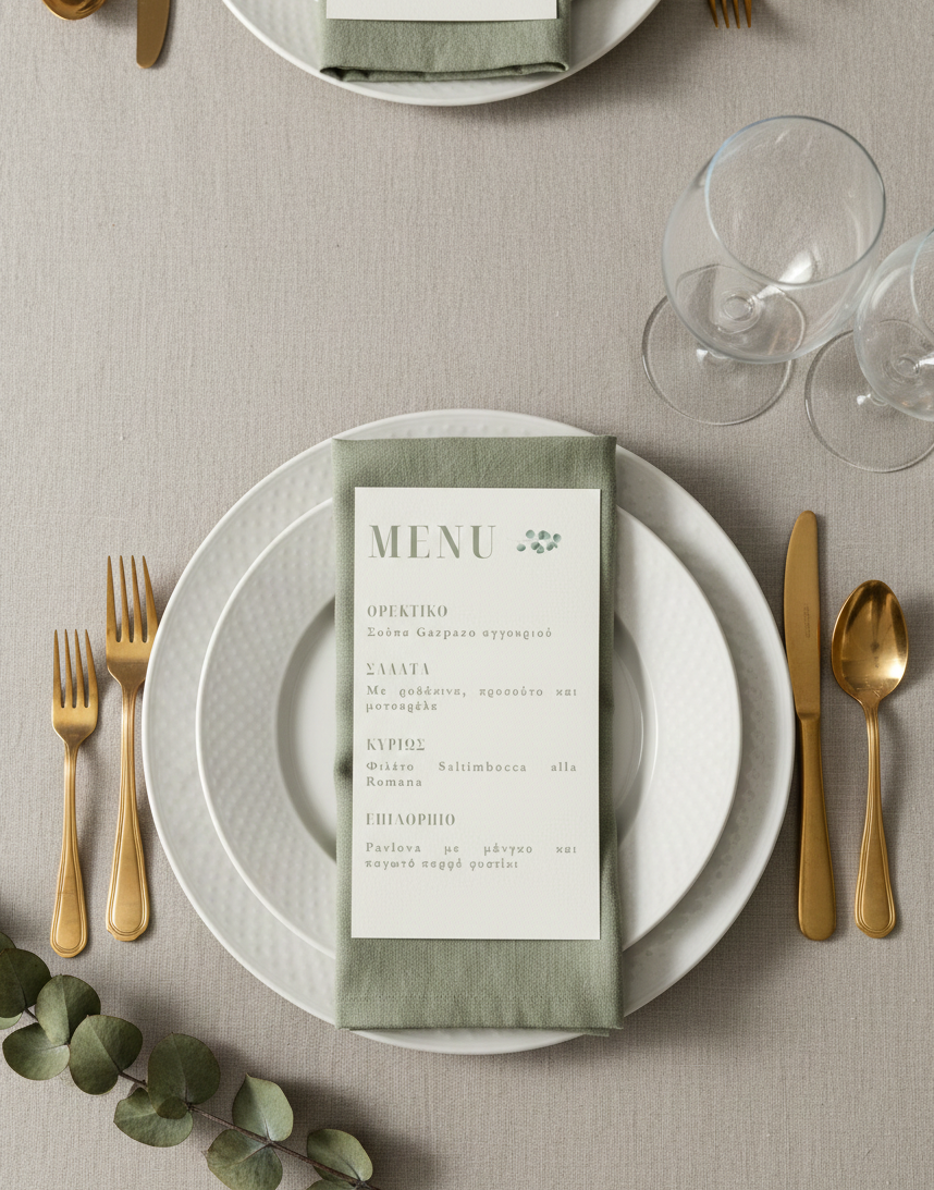 Προσέξτε και την παραμικρή λεπτομέρεια τοποθετώντας κάρτες με το μενού της δεξίωσης σας στα τραπέζια των καλεσμένων σας για ένα πλήρως ολοκληρωμένο event στο θέμα που έχετε επιλέξει.