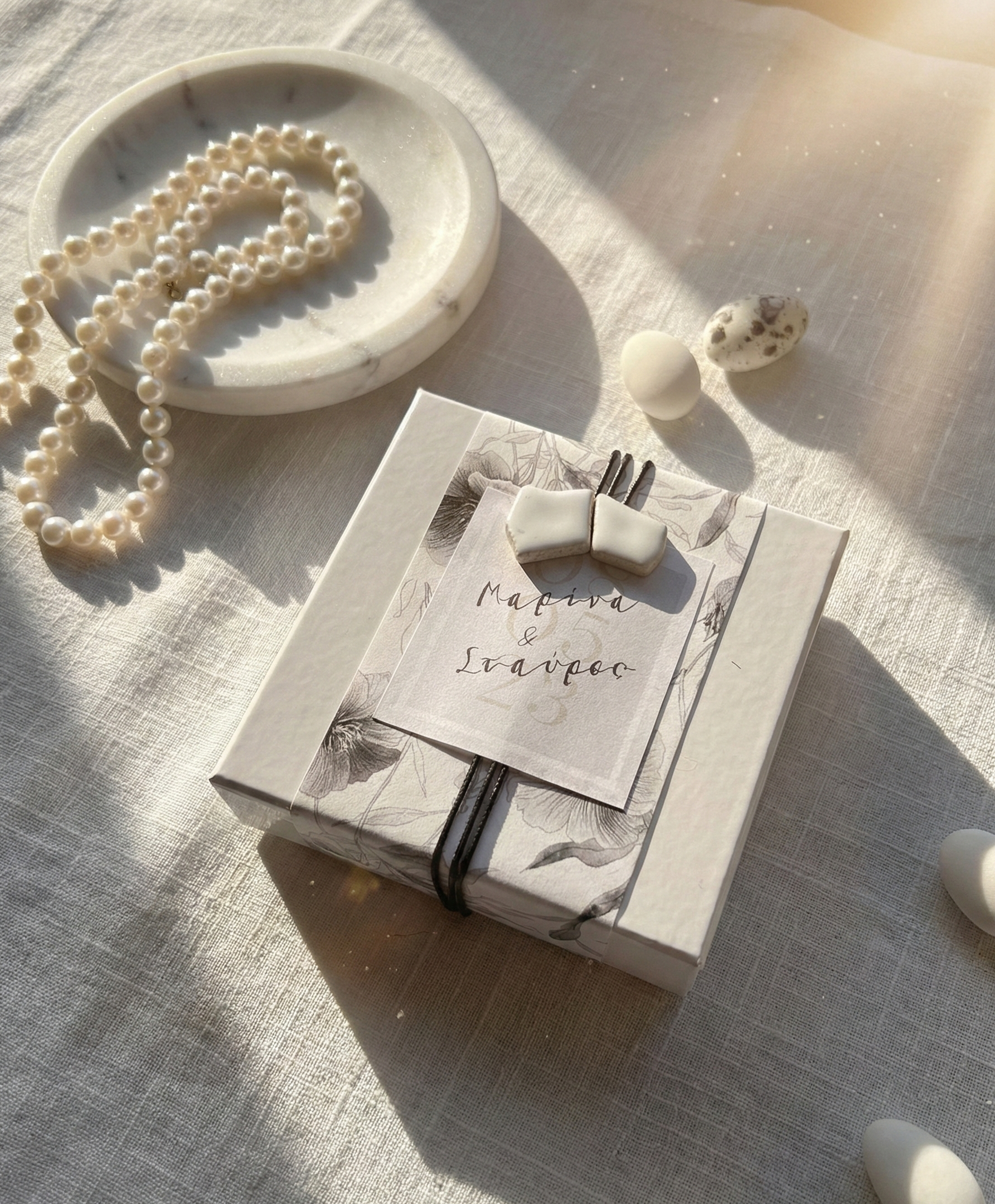 Δετή έτοιμη μπομπονιέρα σε χάρτινο λευκό κουτί πολυτελείας, 5 λευκά και λευκά με μαύρο splash κουφέτα, διακοσμημένη με δεμένo μοτίβο, μαύρο κορδόνι και κεραμικά ασύμμετρα στοιχεία. Συνοδεύεται από καρτελάκι με τα ονόματα του ζευγαριού που μπορείτε να συμπληρώσετε στο παρακάτω πλαίσιο.