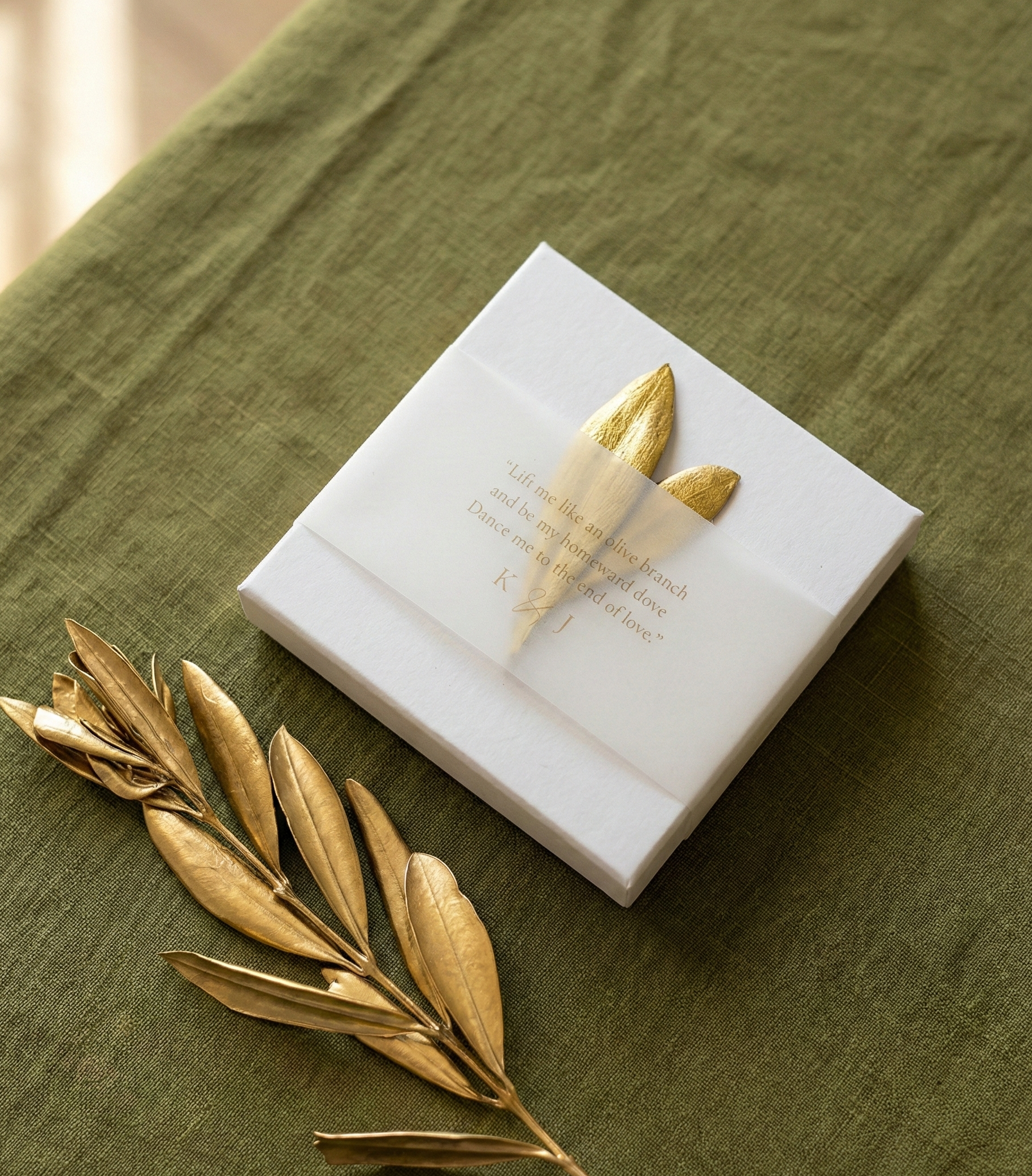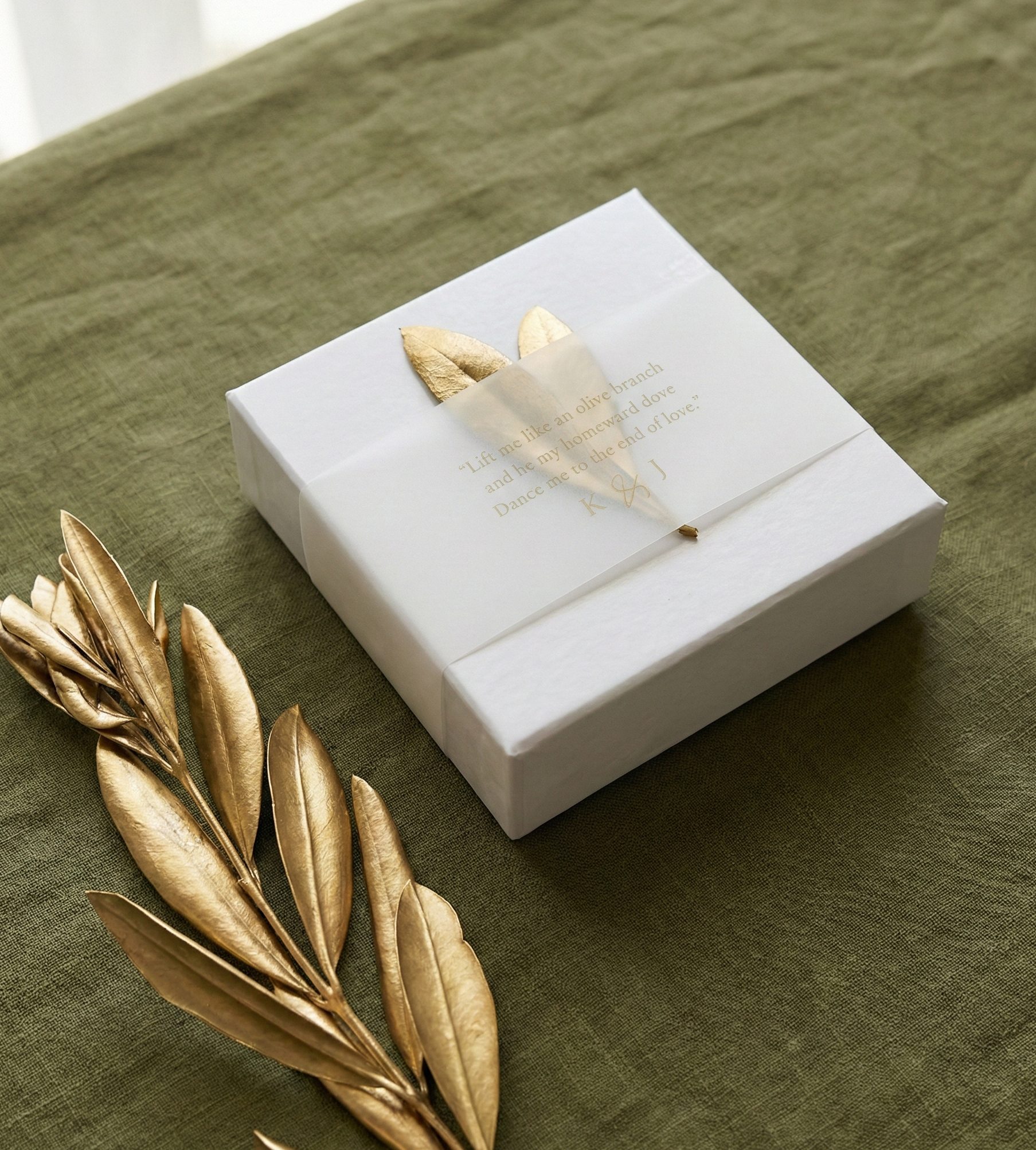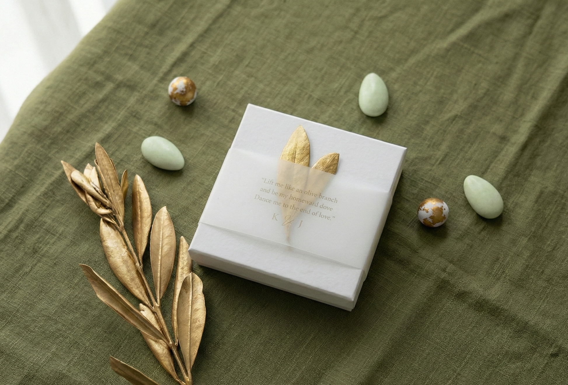 Δετή έτοιμη μπομπονιέρα σε χάρτινο λευκό κουτί πολυτελείας, 5 λευκά gold splash και λαδί κουφέτα, διακοσμημένη με χρυσά φύλλα ελιάς και διάφανο χαρτί με επιγραφή και τα αρχικά γράμματα των ονομάτων του ζευγαριού που μπορείτε να συμπληρώσετε στο παρακάτω πλαίσιο.
